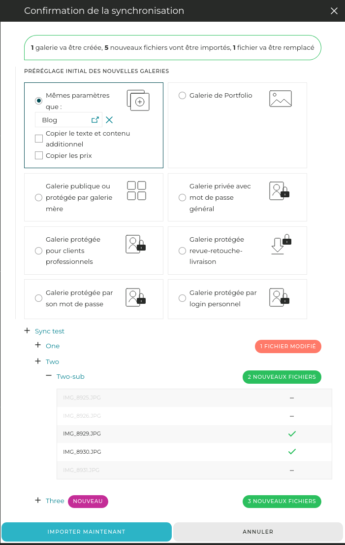 - Importation groupée de dossiers : synchronisez des arborescences de dossiers entières en une seule fois, en conservant votre structure pré-organisée. Idéal pour livrer des prises de vue volumineuses ou migrer depuis une autre plateforme.